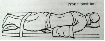 Prone Position:– The client lies flat on the abdomen with head turn to one side. The head rest on a pillow. One or both arms rest in a comfortable way beyond the head or at the side of the head.
