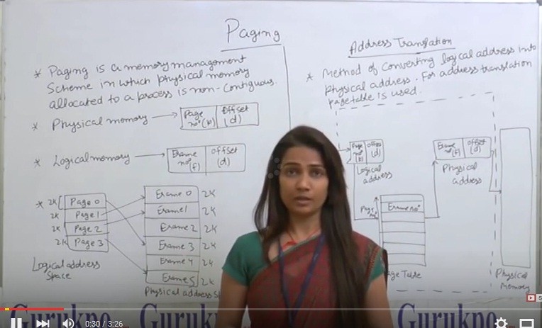 Ms. Karuna Yadav, Biyani Girls college, Jaipur, explains about paging which is a memory management scheme in which process is allocated in a non contiguous manner. It uses page table having page number and frame number.